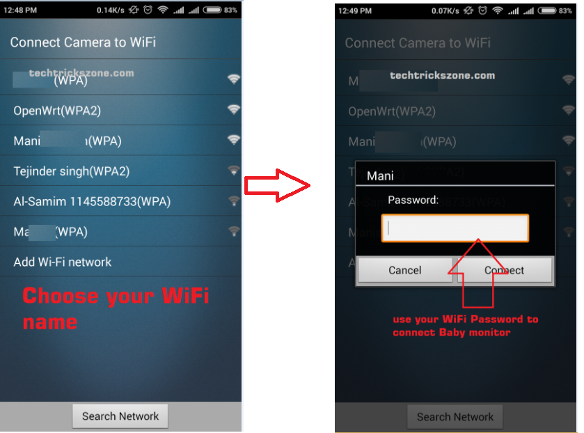 Once you will get the Wi-Fi network name list just find your Wi-Fi name and select it. Put the password of your Wi-Fi name to authorize to connect your network to the baby monitor camera.