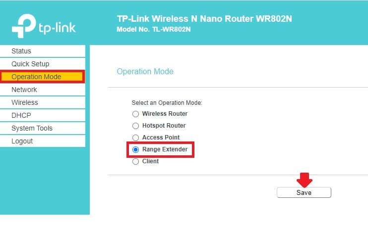 Operation Mode- Range Extender (select range extender and press save button)
