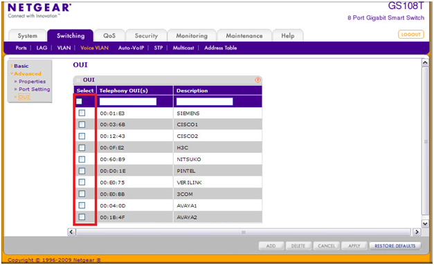 To Delete Voice VLAN OUI select port no from the list and click the delete button from bottom options bar and apply for save changes.