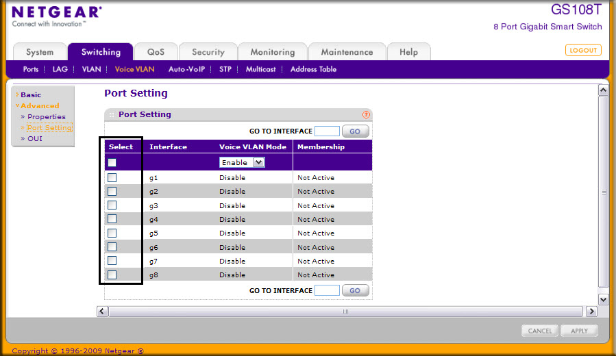 Select Port from the list and select Enable Disable from Voice VLAN mode to enable and disable Voice VLAN on Particular Port. You can select multiple ports to enable Voice VLAN settings.