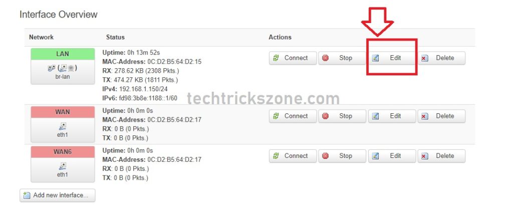 Click Edit on LAN and change IP address and disable DHCP server