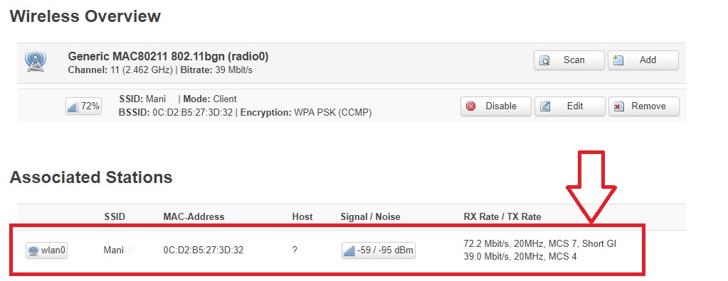 In status, you can see remote device Mac address signal with noise.