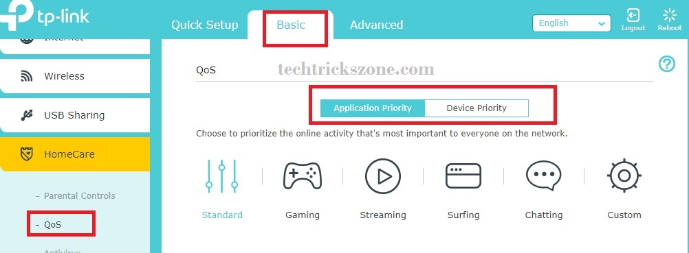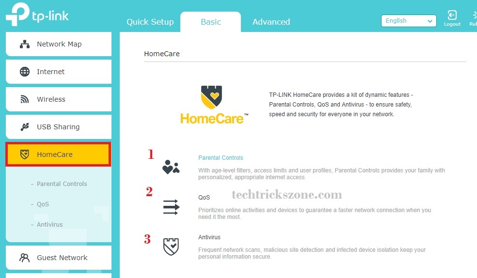 TP-Link router added a category of Homecare which contains settings parental control, antivirus, and QoS for bandwidth allocation based on priority user and application.