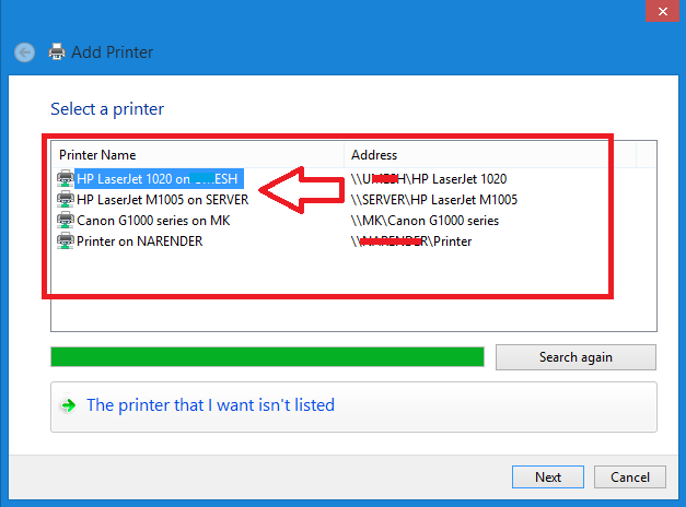 Wait for 5-10 second computer will search all printers shared in the network. Once you will get your printer name in list select printer and click next button as shown in below picture.