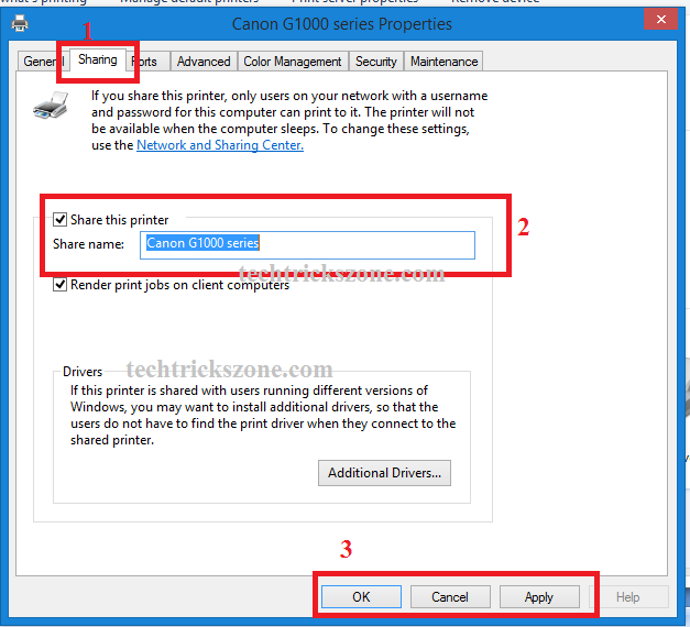 2: Share this printer – check box for enabling share option you can change share name for the same printer.
