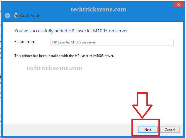 You will get next windows with “You’ve successfully added HP LaserJet on server” same you will get with your pc name and printer name. click next window to confirm adding printer.
