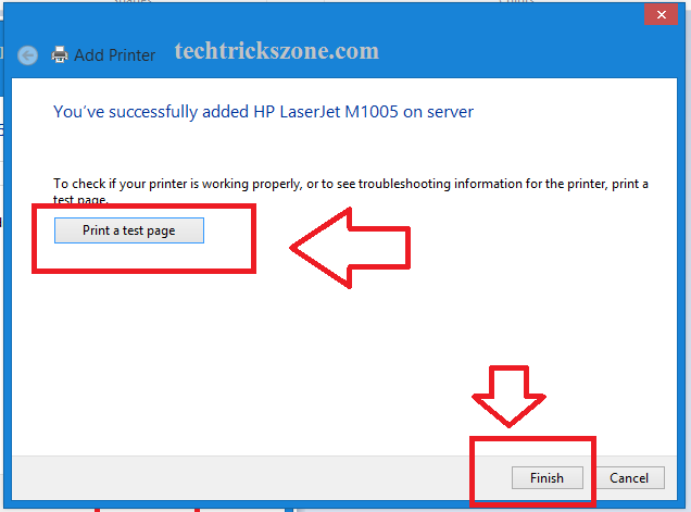 In next steps, you will get the Print a test page option to confirm printer added correctly. If you wish to test the printer click button and finish the wizard.
