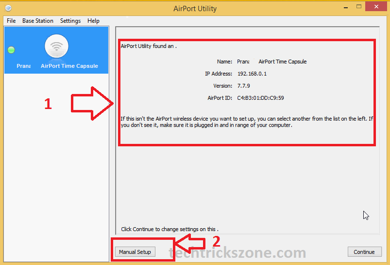 Once you have connected properly to a time capsule then open the airport utility, and it will take a few seconds to detect your Time capsule device and will show your IP Address and other device information.
