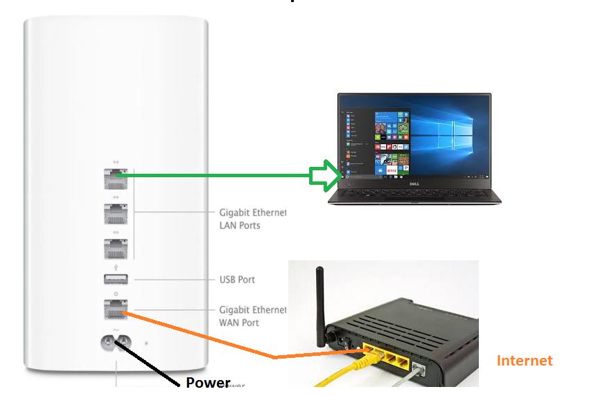 To configuration of the Apple time capsule required a wired or wireless connection to the Laptop or PC. As shown below picture power on the Apple time capsule with power cable comes with a box and WAN port connect to the internet modem/router. You can connect a Laptop/PC with a LAN port or wireless connection.