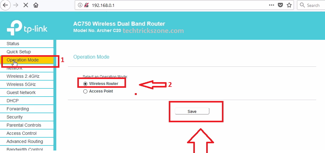 To change TP-Link AC750 Operation mode click on the side menu list. Find the operation mode option.