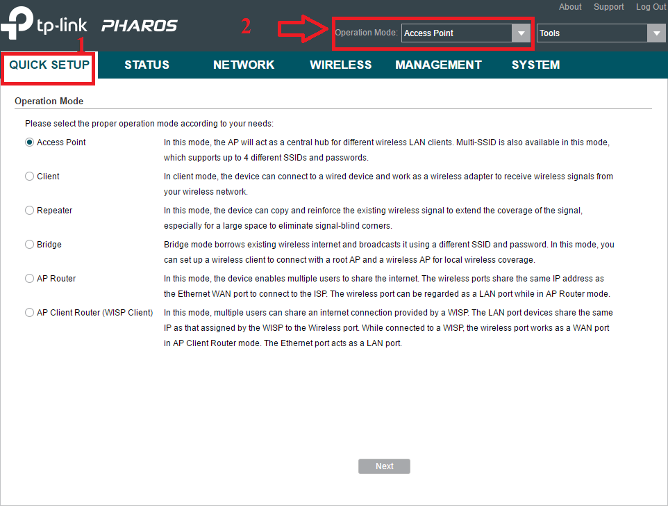 In Manual mode first, you have to choose router mode from operation option in the top. In this post, we are going to configure TP-link CPE220 in AP mode so we choose Access Point mode.
