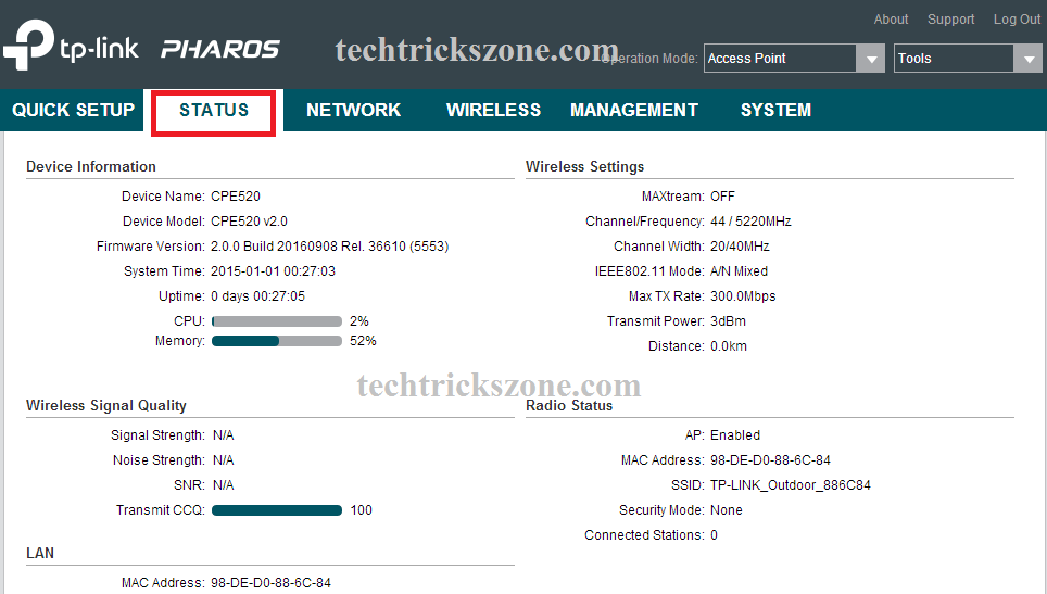 TP-Link outdoor 5Ghz and 2.4Ghz CPE Wireless CPE landing page is the status page. In the status page, you can see all the configuration detail and CPU and Memory usage status. You will get a Wireless setting as well as connected client, Network, and Hardware information in the status page.