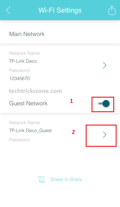 Open Deco Apps in your Android or iPhone just shake your Phone your will option to share Wi-Fi network Main Network and Guest Network. Just click the network you want to share.