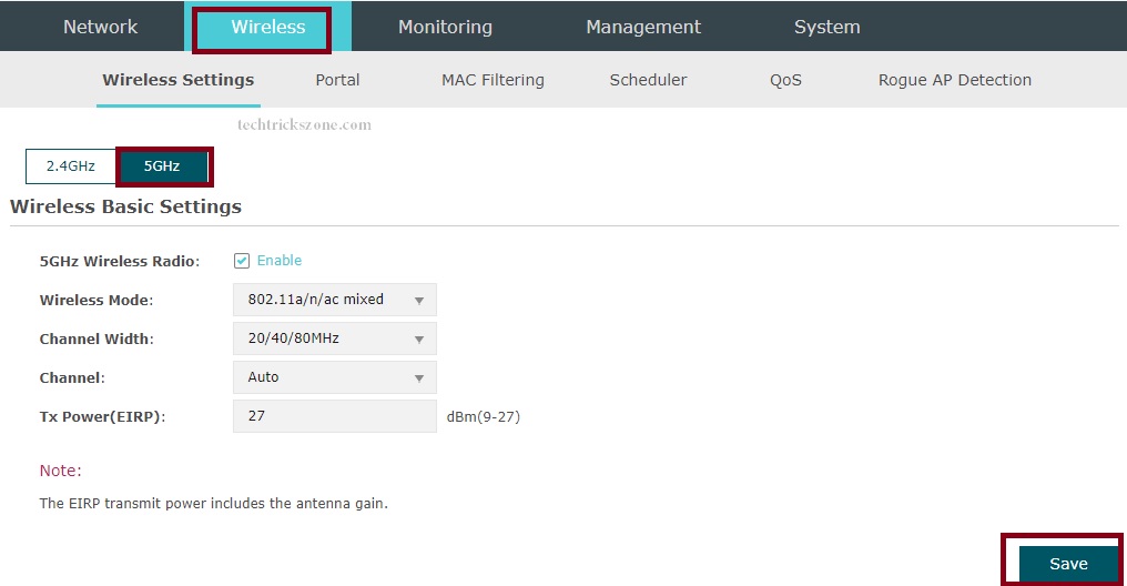 Tx Power (EIRP): 27(choose the Tx power as per area you want to cover).