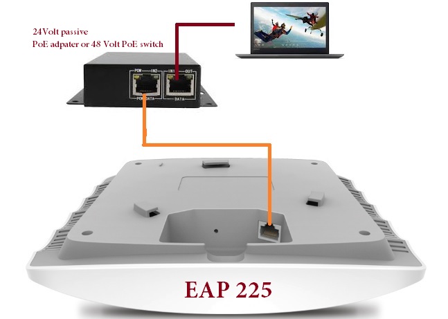 Connect PoE out from PoE adapter to EAP225 LAN port to power on using 4 Pair cat6 patch cord. Connect PoE adapter LAN port to PC/Laptop to make web interface access.