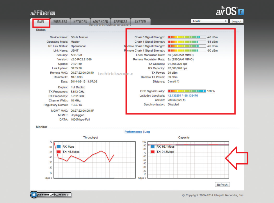 After completing the Master and Slave configuration, you can see the Link Quality, CCQ, and Throughput Status on the Main page of AirFiber AF5 and AF5U