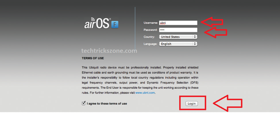 - Open Web Browser Type 192.168.1.20 and use username and password is ubnt/ubnt to login airFiber 5.
