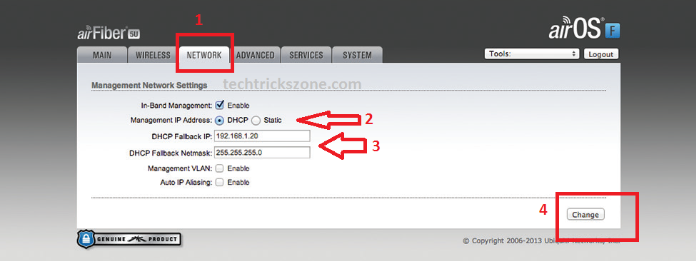 airFiber configures with default IP 192.168.1.20 so every device must have a unique IP Address. In point-to-point radio, both location airFiber devices should have different IP Addresses. You can Change IP Address from the Network tab by following below instructions.