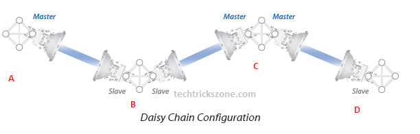 A Daisy chain is nothing but used like a relay for extending a Point-to-point link to increase the distance. In this mode, both nodes should be configured in the same mode at the same location. Exp: if location A configured with Master then the daisy chain radio must be configured in master mode. See the below picture to understand clearly.