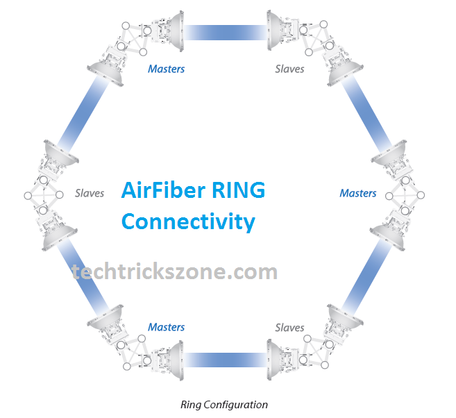 The ring stands for a redundant wireless path to avoid network down depending on the single point-to-point connectivity. In-Ring uses multiple radios to create a ring path if one path goes down then the network will be connected through other paths without going down. One AirFiber radio will be configured as Master and the second configured as Slave.