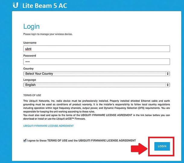 If you have used any Ubiquiti wireless device before then the configuration of Lite beam is simpler for you. The first-time login of the Ubiquiti network device needs to set the country and language with accepting terms and conditions as per UBNT policy.