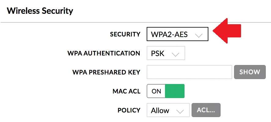 Security: Choose WPA2-AES (select same security type configured in AP Device)