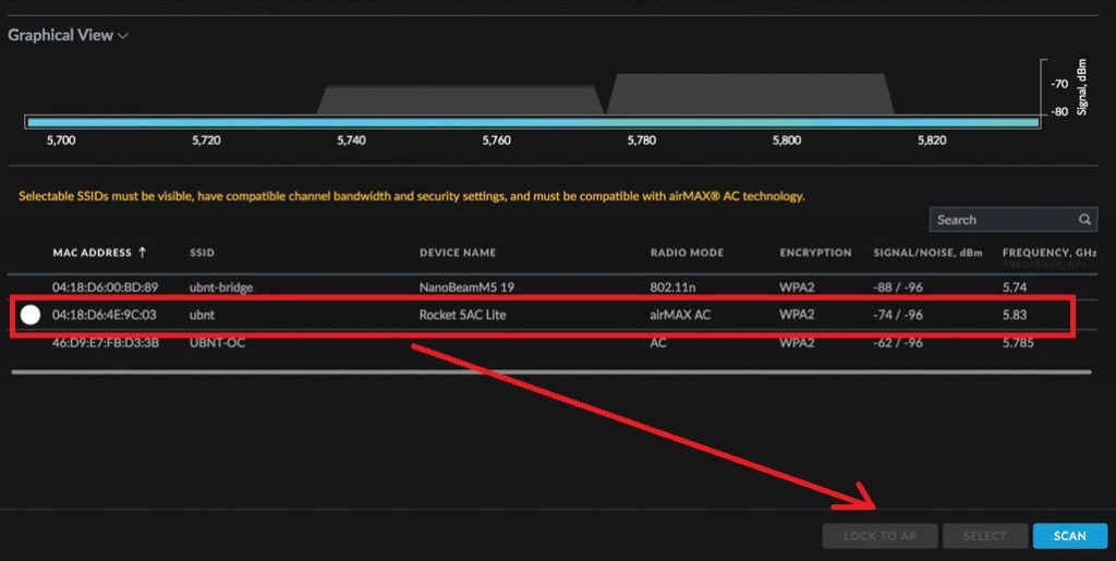 2: Select– click the select button to scan Rocket 5AC prism AP device