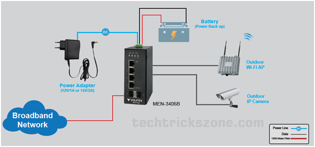 Voltek MEN-3406B L2 Switch configuration with Managed Layer 2 Access Gigabit Ethernet Switch with 4-port 10/100/1000Base-T + 2-slot Gigabit SFP, in switch model B stand for a Battery supported for backup during power frailer to avoid network downtime. It is designed for rural and villages where power cut issues. MEN3406 provide 2 SFP port to directly connect fiber to the switch for uplink and 4 copper Giga port provide 1gbps speed to end user. Voltek 3406B L2 managed switch managed with the web as well as console. Voltek 3406B L2 Managed Switch Equipped with Dual 100/1000 multi-rate SFP uplinks which can be.
