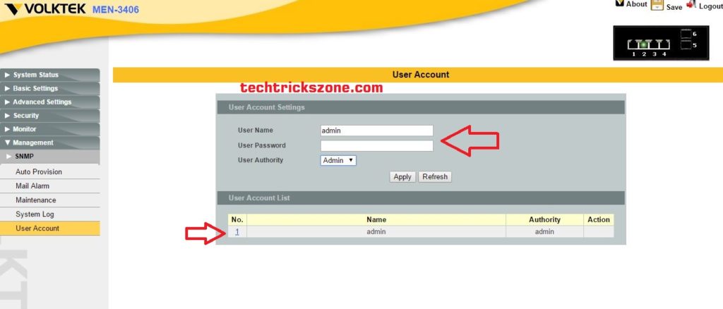 How to add a user Account in Voltek MEN -3406 L2 Switch from WEB :