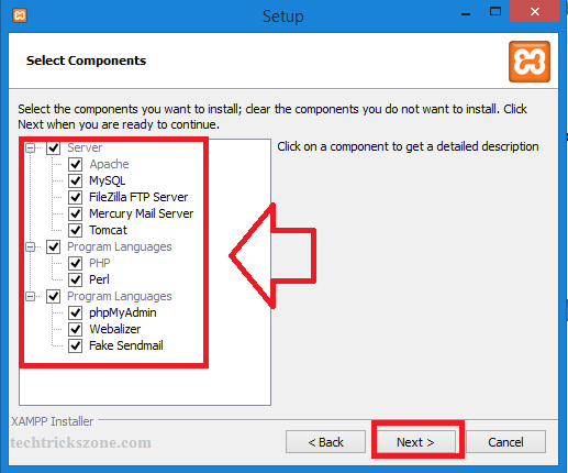 As the Xampp server includes many components so in the next step you will get all component selection windows for installation.