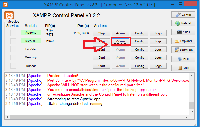 Open XAMPP and click the admin button to open PHPMyAdmin control panel.